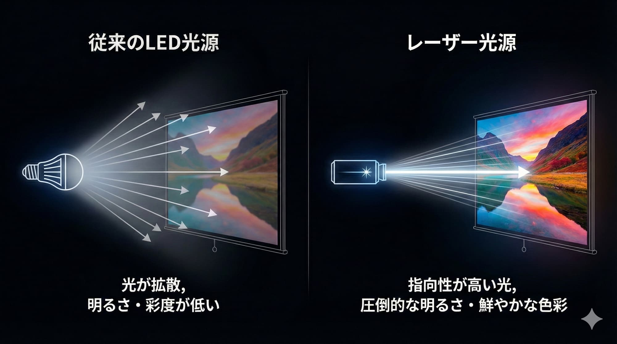 この製品の最大の特徴は、名前に「Laser」とある通り、光源にレーザーを採用している点です。